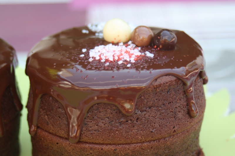 En el caso de estas minicake, la decoración final ha consistido en cubrir con una ganaché de chocolate, unas bolitas de cereales con chocolate y un poco de azúcar de colores.